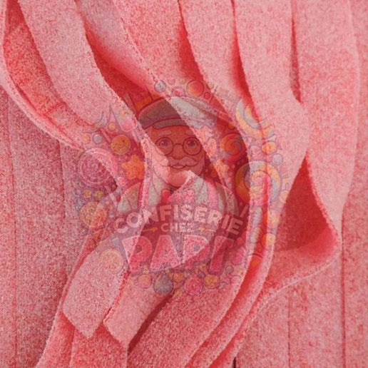 Cette longue bande gélifiée à la fraise est enrobée d’un sucre surette. Sa texture moelleuse et son goût intense de fraise en font une friandise irrésistible pour les amateurs de bonbons acidulés.